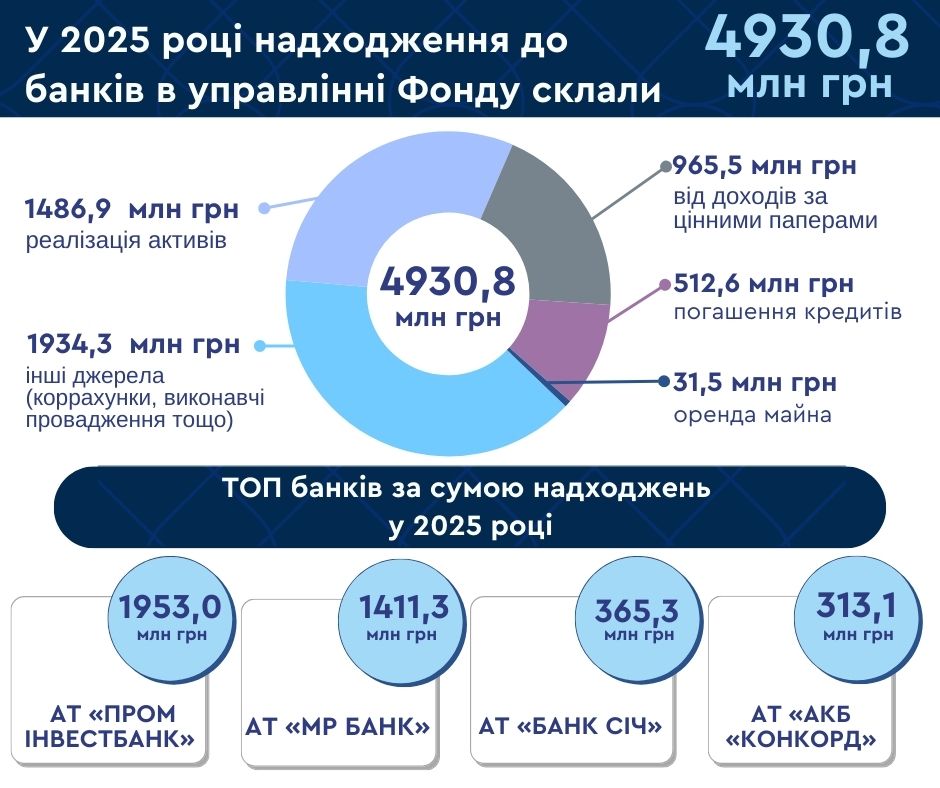 Протягом 2025 року надходження до банків, що ліквідуються Фондом гарантування вкладів фізичних осіб (далі – Фонд), склали 4930,8 млн грн.